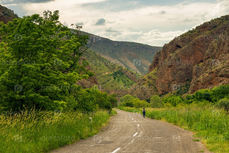 Шоссе в живописном ущелье с красными горами возле монастыря Нораванк, Армения