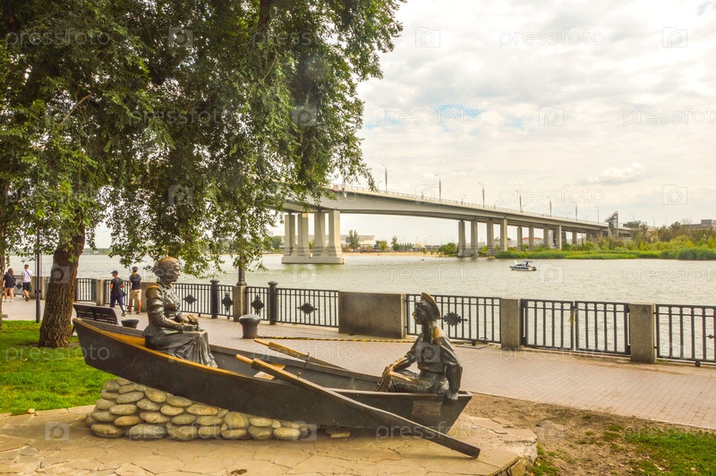 Скульптура Григорий и Аксинья в лодке на фоне Вороши́ловский мост — мост в Ростове-на-Дону через реку Дон