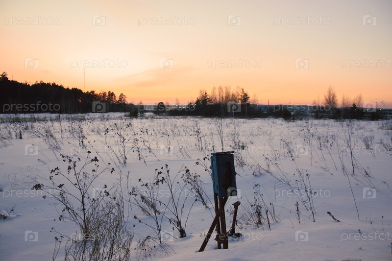 Зимний пейзаж с далеким горизонтом во время заката на заснеженном поле рядом с лесом