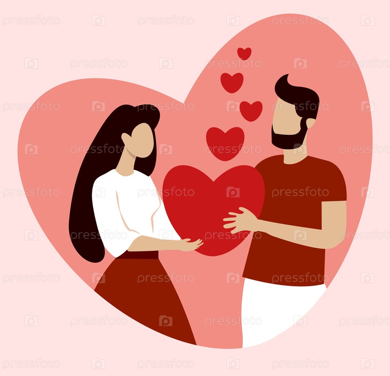 Пара радостно обменивается большим сердцем в День святого Валентина. Они стоят рядом, окруженные плавающими формами сердца, создавая романтическую атмосферу, идеально подходящую для этого случая