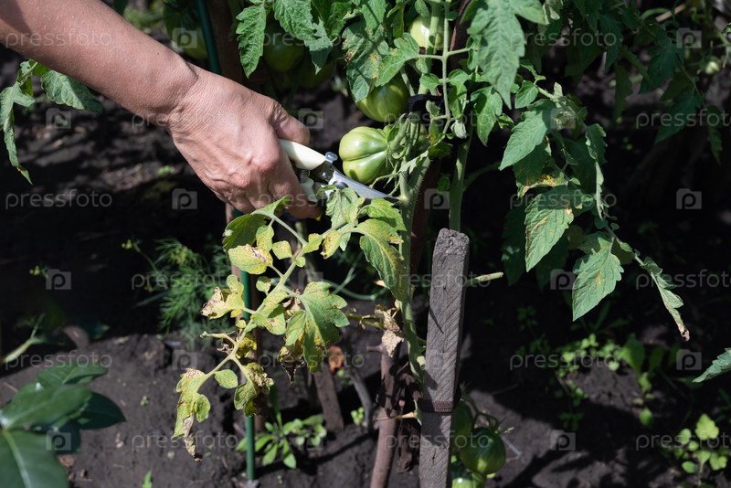 Руки тщательно обрезают томатные растения в саду поздней весной в солнечный день