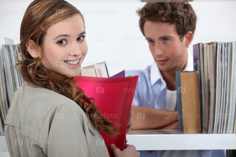 Пара флиртует в библиотеке