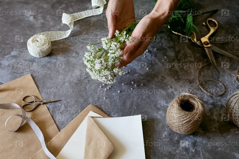 Создание деревенской цветочной композиции с натуральными материалами на текстурированной поверхности в уютном крафтовом пространстве
