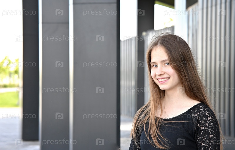 Молодая девушка в черном платье стоит перед современным металлическим забором на открытом воздухе