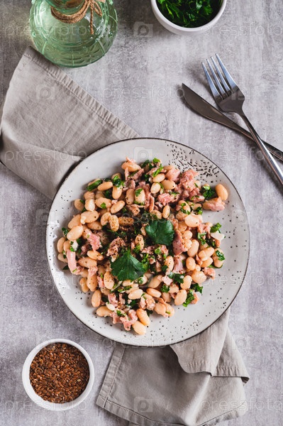 Белковый тунец, бобы, салат из трав на тарелке на столе и вертикальный вид
