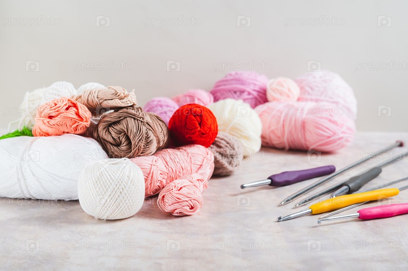 Много красочных пряжек из пряжи, крючков и вязальных игл на столе