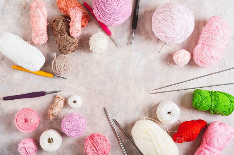Каркас цветных шариков из шерсти и хлопка, крючки и вязаные иглы на вид сверху стола