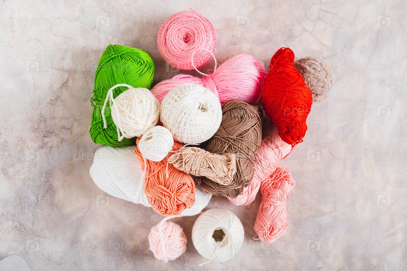 Много цветных пряжек из пряжи в куче на вид сверху стола