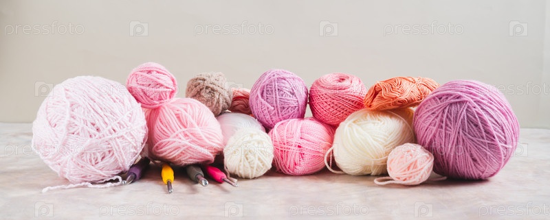 Много красочных пряжек из пряжи, крючков и вяжущих игл на столе веб-баннер