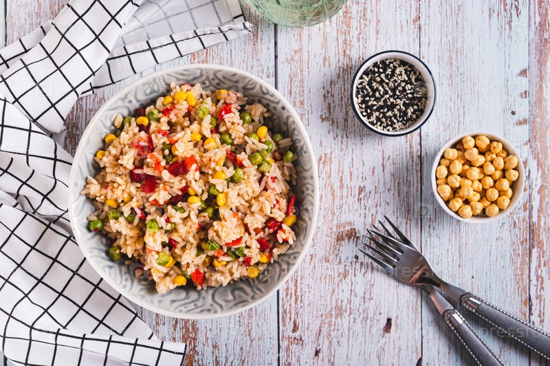 Домашний жареный рис с горохом, кукурузой и перцем в миске на вид сверху стола