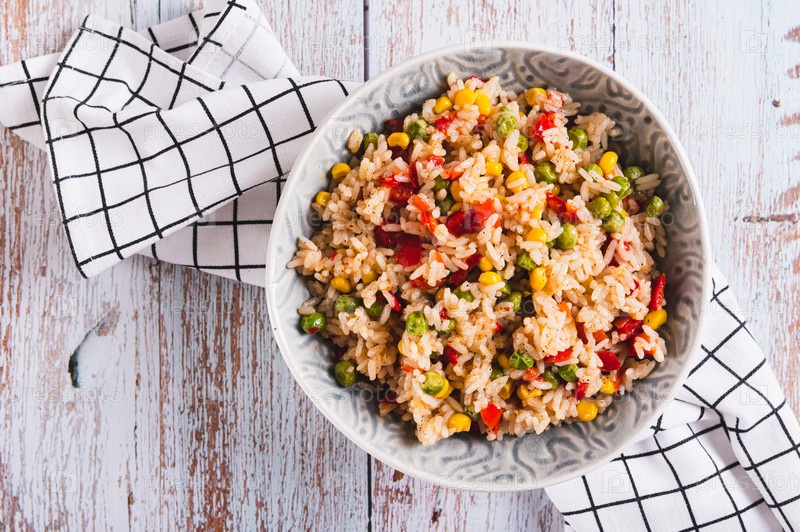 Закрыть домашний жареный рис с горохом, кукурузой и перцем в миске на вид сверху стола