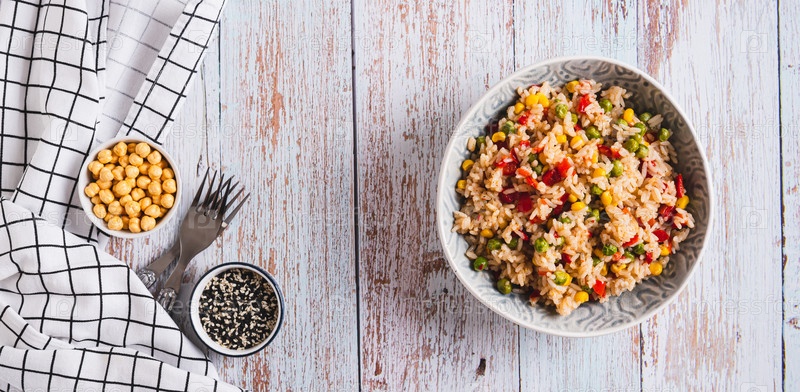 Чаша приготовленного риса и овощей для гарнира на веб-баннере с видом на стол