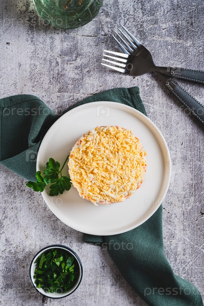 Классический салат мимоза с консервированной рыбой и овощами на тарелке на столе и с вертикальным видом