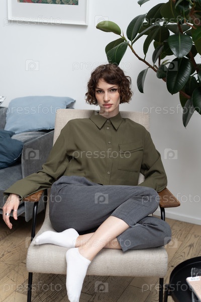 Молодая красивая женщина позирует в зеленой рубашке в студии