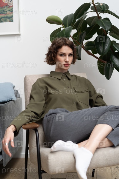 Молодая красивая женщина позирует в зеленой рубашке в студии