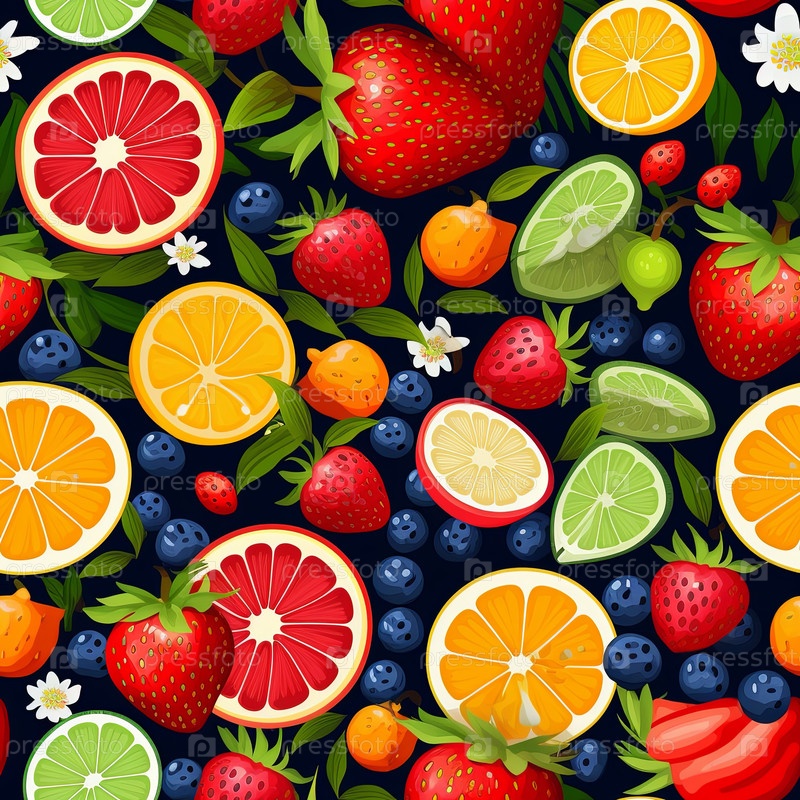 Яркий и красочный бесшовный рисунок с ассортиментом спелых и сочных фруктов и ягод, таких как клубника, черника, апельсины, грейпфрут и лайм, на темном фоне