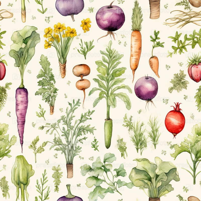 Бесшовный узор, демонстрирующий иллюстрации в стиле акварели садовых овощей с мягкими и пастельными цветами на светлом фоне