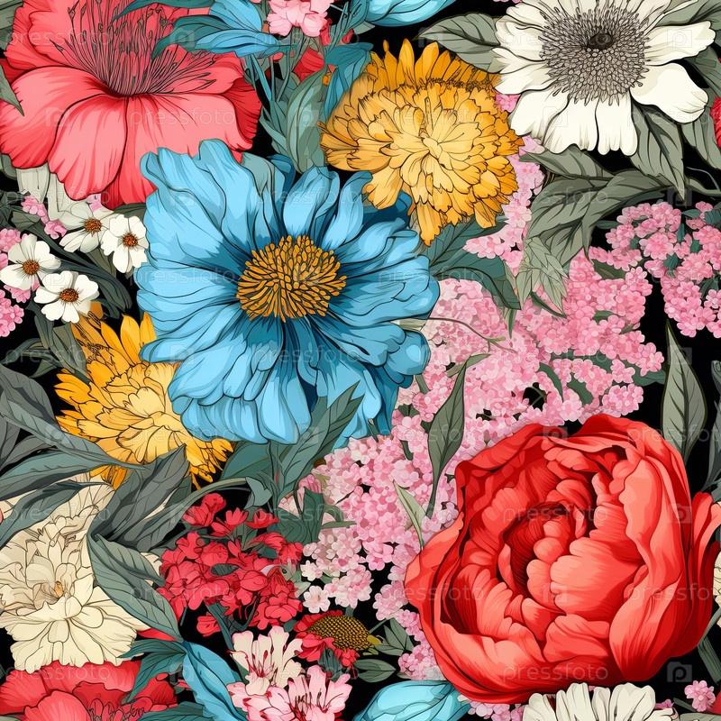 Бесшовный узор с цветами в ярких и контрастных цветах