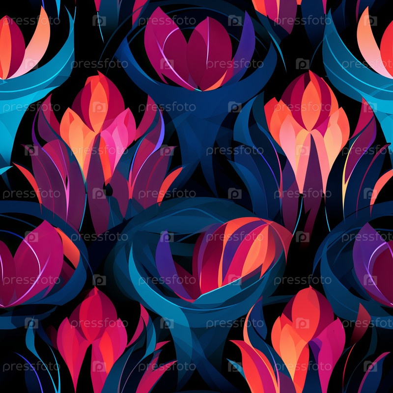 Абстрактный бесшовный узор с стилизованными и геометрическими интерпретациями цветов, создающий современный и художественный дизайн. Печатное искусство