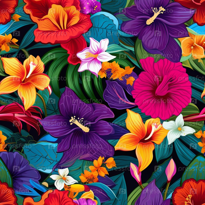 Яркий и красочный бесшовный узор с множеством тропических цветов, таких как гибискус, плюмерия и орхидеи