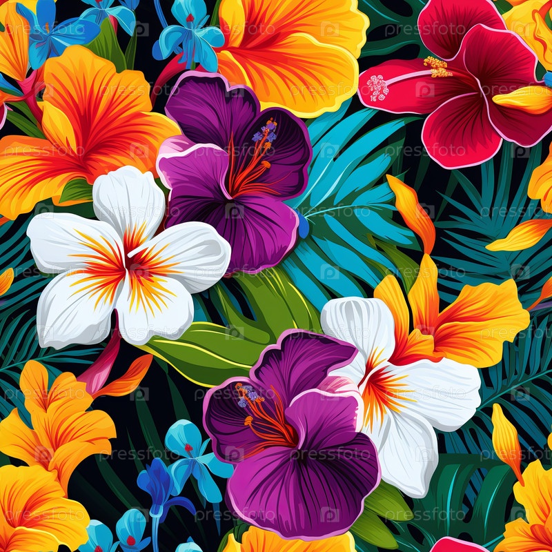 Яркий и красочный бесшовный узор с множеством тропических цветов, таких как гибискус, плюмерия и орхидеи