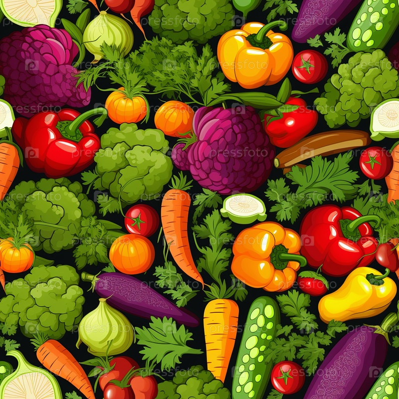 Яркий и красочный бесшовный узор с множеством свежих овощей, таких как морковь, брокколи и перцы на темном фоне