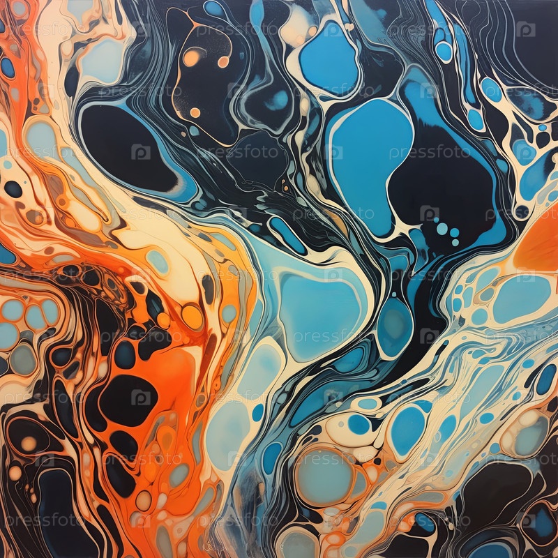 Абстрактная динамическая иллюстрация многоцветной жидкости и органических форм, напоминающая текущую воду или расплавленную лаву. Печатное искусство