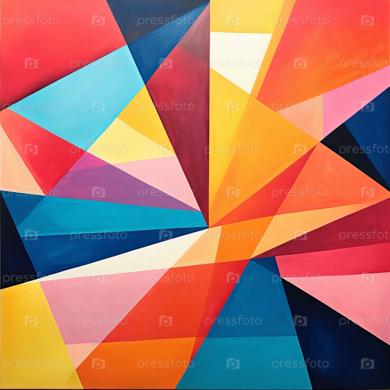 Абстрактное печатное произведение с динамическим взаимодействием ярких цветов и геометрических форм