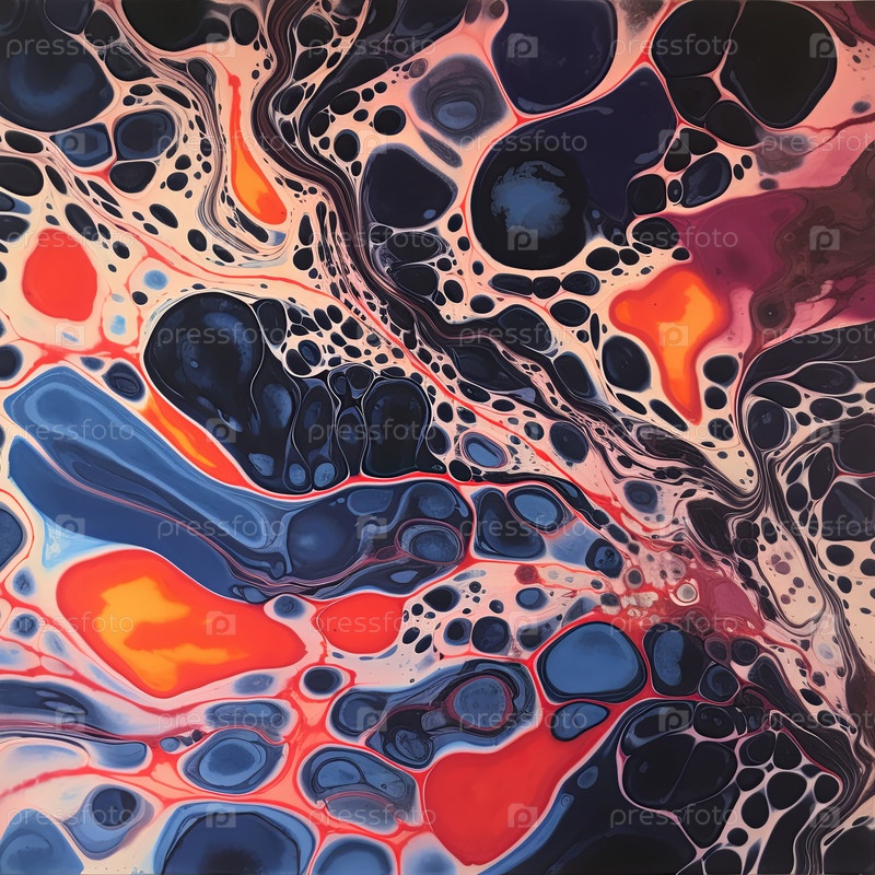 Абстрактная динамическая иллюстрация многоцветной жидкости и органических форм, напоминающая текущую воду или расплавленную лаву. Печатное искусство