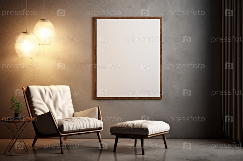 Интерьер гостиной в современном роскошном стиле с белым пустым картинным холстом для макета, висящего на темном Серая стена над креслом с подставкой для ног