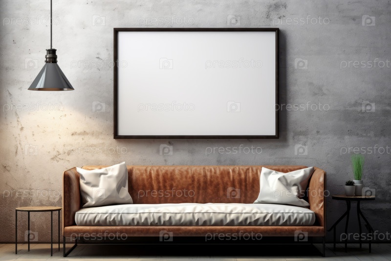 Интерьер гостиной в стиле Industrial Chic с белым пустым картинным холстом для макета, висящим на грубой бетонной стене над диваном