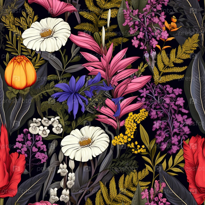 Бесшовный рисунок с подробными иллюстрациями ботанических образцов, таких как папоротники, листья и цветы