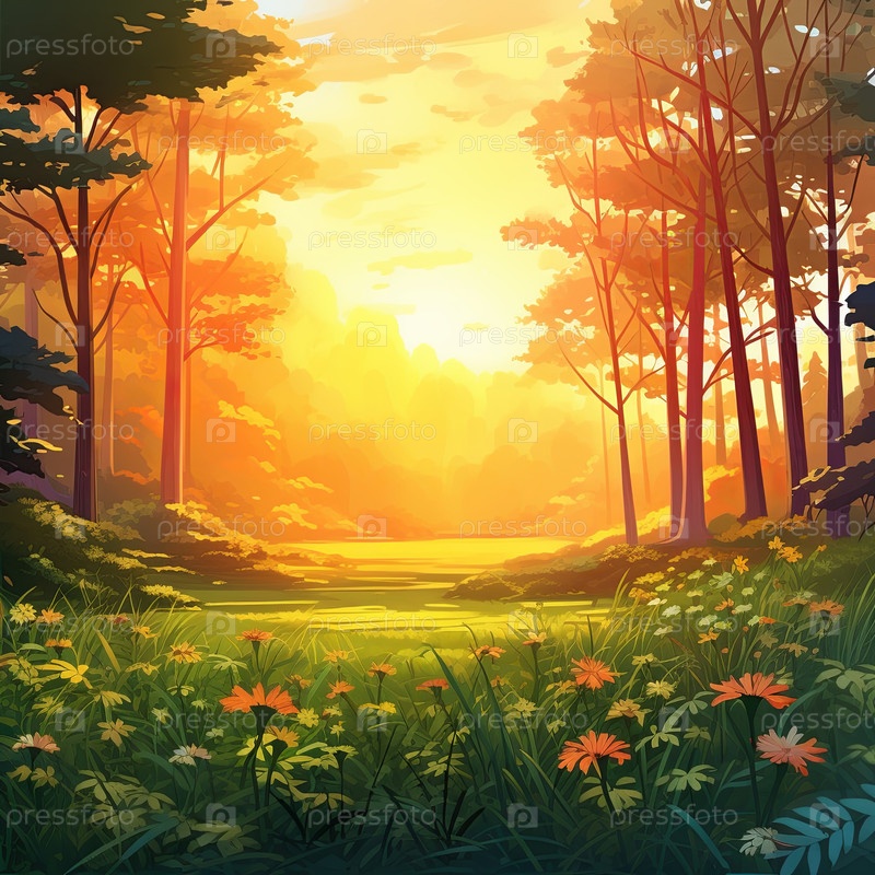 Иллюстрация безмятежного и успокаивающего, захватывающего красоту спокойного леса в золотые часы восхода или заката солнца