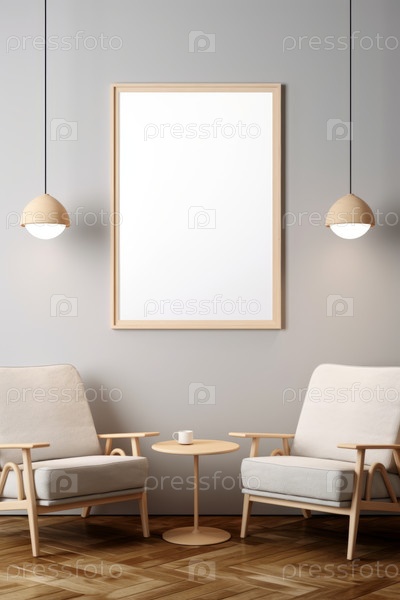 Интерьер гостиной в скандинавском стиле с белым пустым холстом для макета, висящим над креслами и кофейным столиком