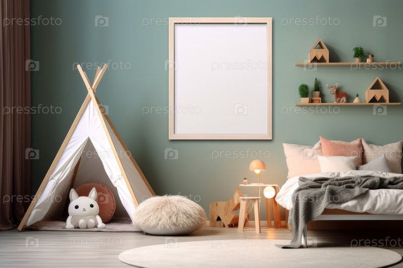 Интерьер детской комнаты в современном стиле с пустым, пустым белым плакатом для макета, висящим на стене