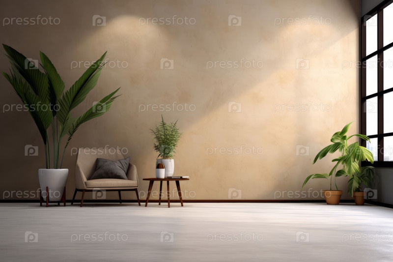 Интерьер пустой комнаты в минималистском стиле гранжа с креслом, горшечными комнатными растениями и пустой стеной для макета, монтажа, копирования пространства