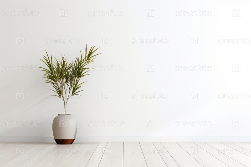 Интерьер пустой светлой комнаты в минималистском скандинавском стиле с деревянным полом, горшечным комнатным растением и пустой стеной для макета, монтажа, копирования пространства