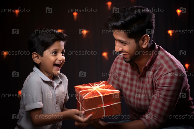 Трогательный момент, когда индийский ребенок получает неожиданный подарок от отца, их лицо светится от радости и удивления. Малая глубина резкости