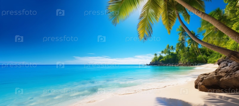 Композиция с нетронутым тропическим пляжем с кристально чистыми лазурными водами и пальмами. Копировать пространство, баннер