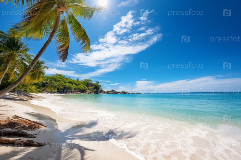 Композиция с нетронутым тропическим пляжем с кристально чистыми лазурными водами и пальмами. Копировать пространство