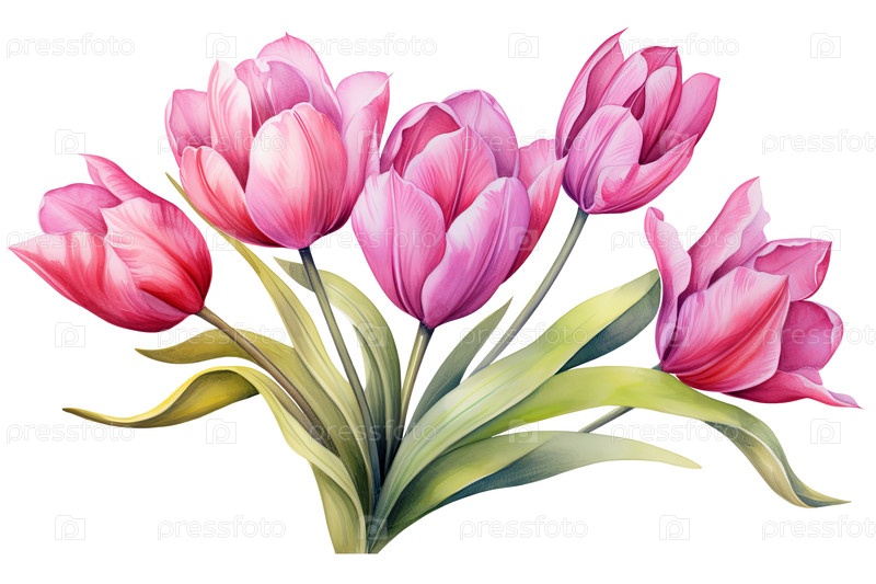 Нежная акварельная иллюстрация букета ярких розовых цветов тюльпанов, расписанных скрупулезными деталями, изолированных на прозрачном фоне