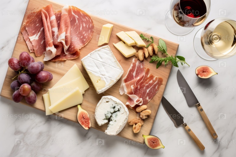Вид сверху на деревянную разделочную доску, заполненную кустарными сырами, отвержденным мясом, свежим инжиром, виноградом и бокалами вина. Плоский мир