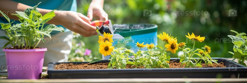 Крупный план рук женщины садоводства посадка желтых цветов. Копировать пространство, баннер