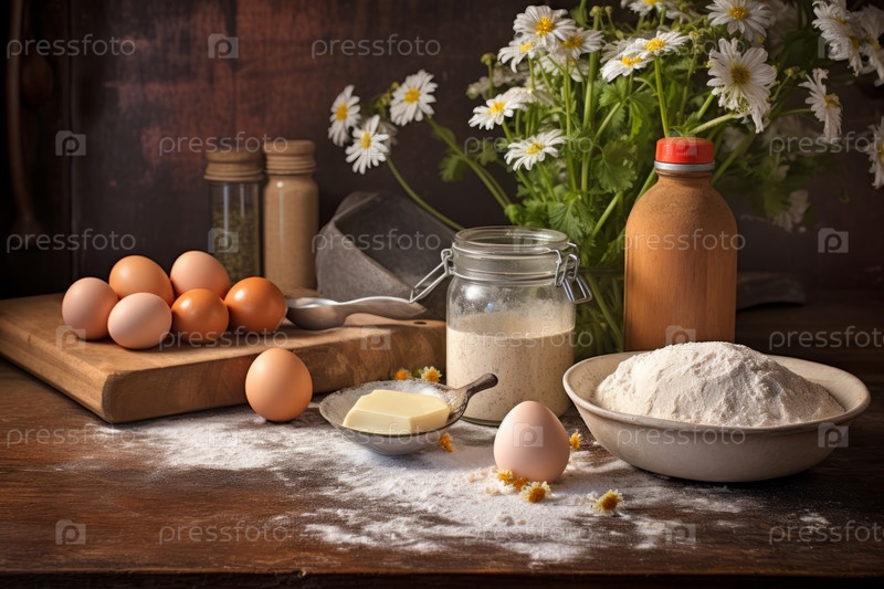 Деревенская кухня со свежими ингредиентами: свежие яйца на деревянной доске, мука и ромашки