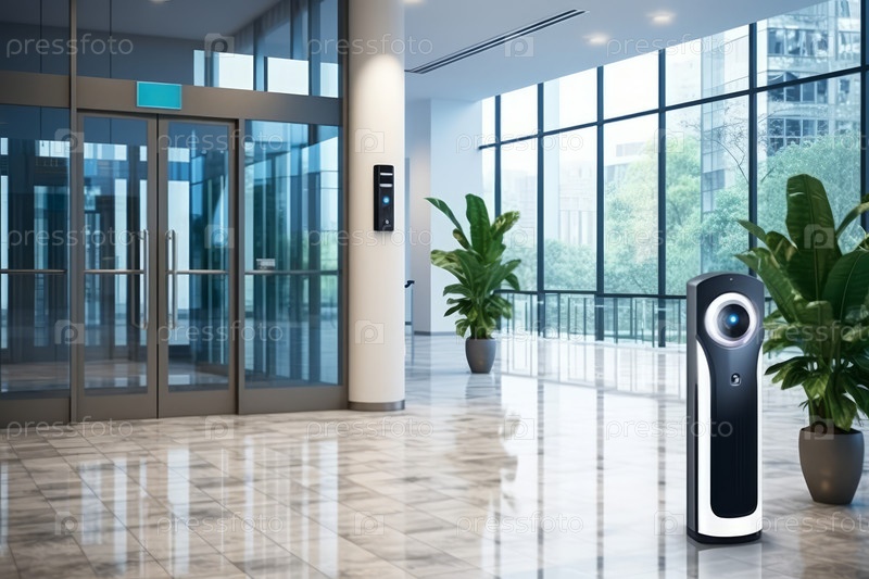 Интерьер современного офисного лобби с интеллектуальными системами доступа и биометрической безопасностью, демонстрирующий передовые решения безопасности, выборочный фокус, неглубокая глубина резкости, размытость