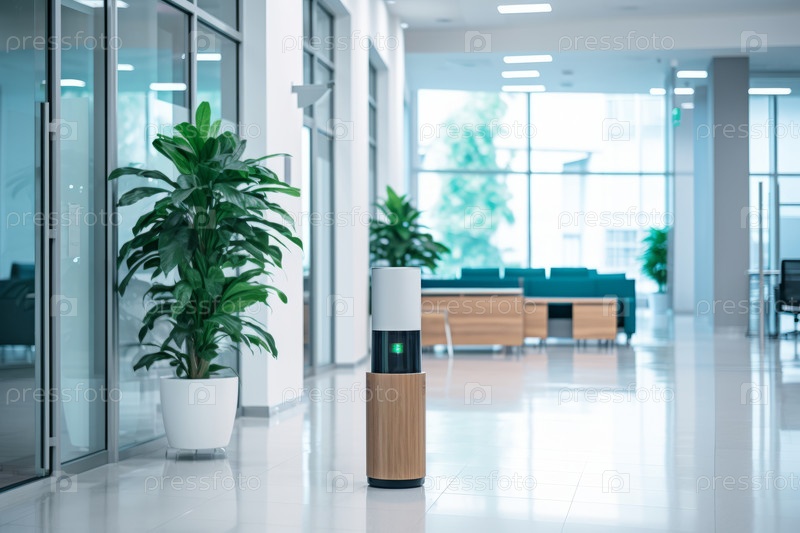 Интерьер современного офисного лобби с интеллектуальными системами доступа и биометрической безопасностью, демонстрирующий передовые решения безопасности, выборочный фокус, неглубокая глубина резкости, размытость