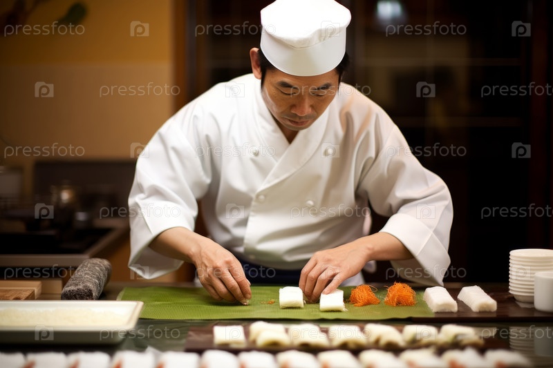 Традиционный японский шеф-повар суши умело готовит суши-роллы
