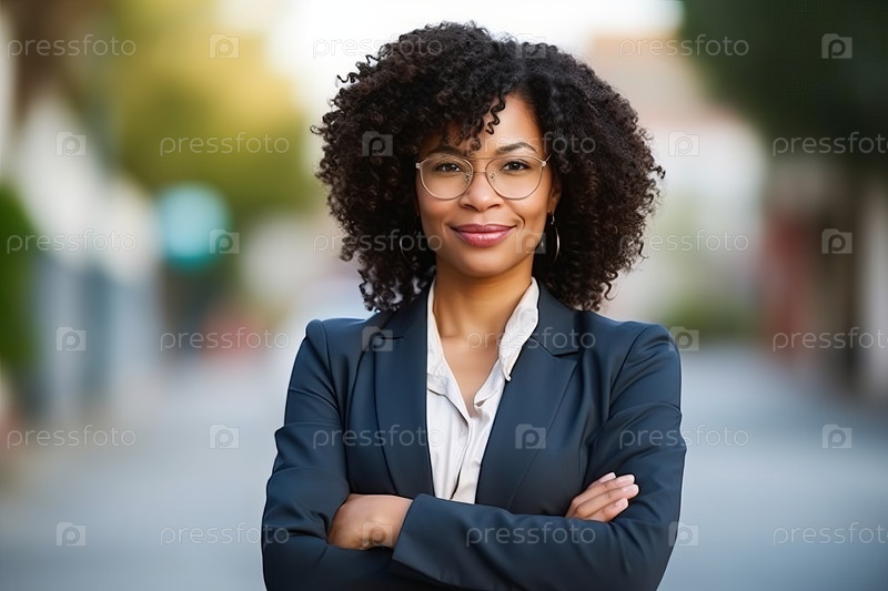 Портрет молодой улыбающейся профессиональной афроамериканской бизнесвумен, уверенной в себе позитивной, стоящей на улице, скрестив руки, глядя в камеру