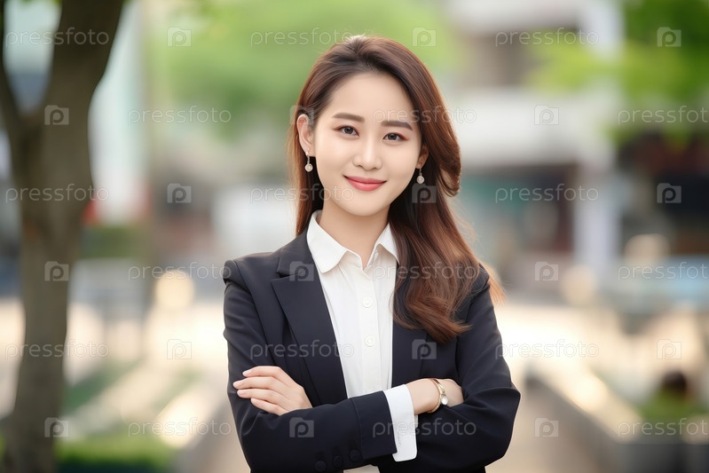 Портрет молодой улыбающейся профессиональной азиатской бизнесвумен, уверенной в себе положительной, стоящей на улице, скрестив руки, глядя в камеру