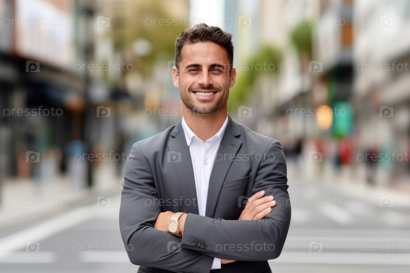Портрет молодого улыбающегося профессионального бизнесмена, уверенного в себе позитива, стоящего на улице скрестив руки, смотрящего в камеру